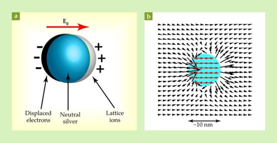 To first approximation, the electrons of the metal nanoparticle move freely and, driven by an external light’s electric field, are periodically displaced with respect to the lattice ions. The displacement creates charges at opposite surfaces. Because those charges attract each other, there also exists a restoring force. The result is an electron oscillator, whose quantum is called a surface plasmon (SP) and whose frequency is determined by the restoring force and effective mass of the electron.
