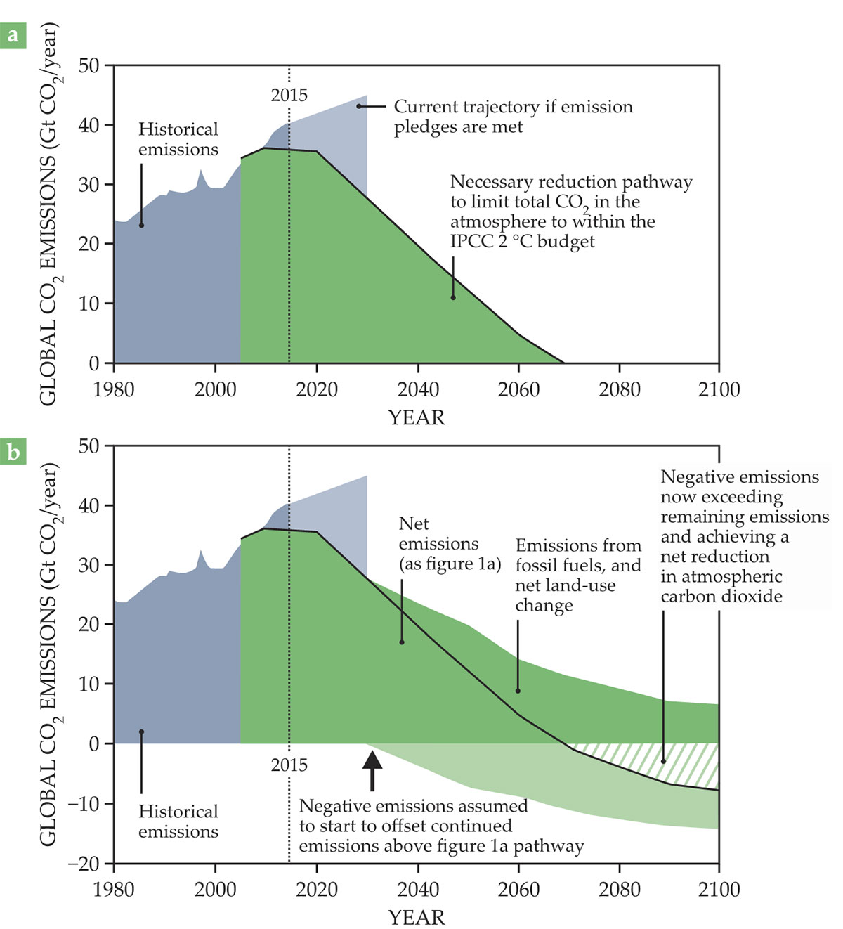 Estimated global reduction (a) in CO2 emissions required to limit temperature increases to 2 °C above preindustrial levels. The gray shaded area at the top shows projected emissions through 2030 if all current emission reduction pledges from the 2015 Paris agreement were to be met. In fact, emissions have continued to grow and are projected to reach record levels in 2019. (b) Gradual reduction in CO2 emissions that could be possible with a significant and growing contribution of negative emissions technologies, beginning around 2030. Note that immediate large reductions to emissions are also required. (Source: European Academies Science Advisory Council policy report 35, 2018, adapted from K. Anderson, G. Peters, Science354, 182, 2016, doi:10.1126/science.aah4567.)