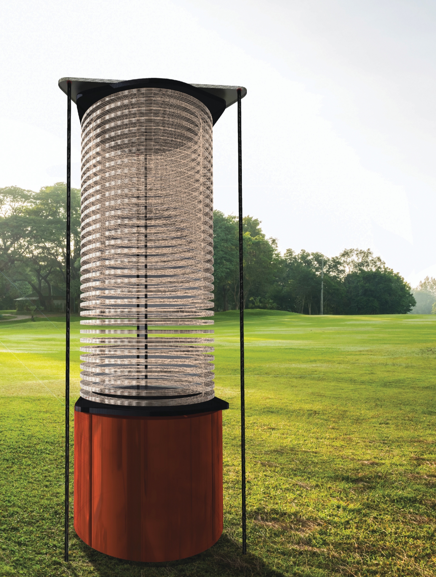 Artist’s concept of an “artificial tree,” a direct air capture system in development by Arizona State University and investors. The translucent spiral structure contains an ion exchange resin that when dry has an affinity for CO2. Once saturated, the spiral structure is lowered into the cylinder, where moist air causes the CO2 to be released and captured.