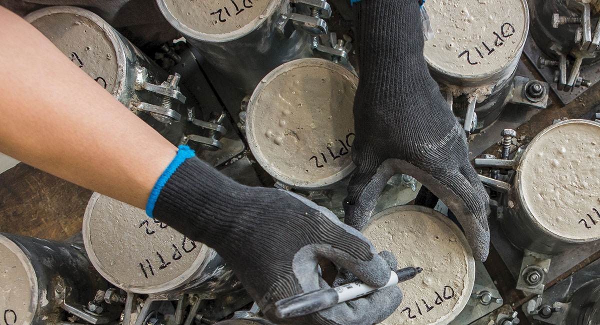 Samples of novel concrete in cylinders are tested by Solidia Technologies employees prior to curing with CO2. Building materials present a route to permanently remove CO2 from the atmosphere.