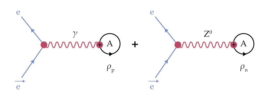 Probing the neutron distribution. The Feynman diagram on the left illustrates the exchange of a photon between an electron and an atomic nucleus, and the one on the right shows the exchange of a neutral weak boson Z0. The quantum mechanical interference of the two generates a difference in the cross section between right- and left-handed polarized electrons. The induced parity-violating asymmetry provides a powerful model-independent tool to probe the neutron distribution of neutron-rich nuclei.