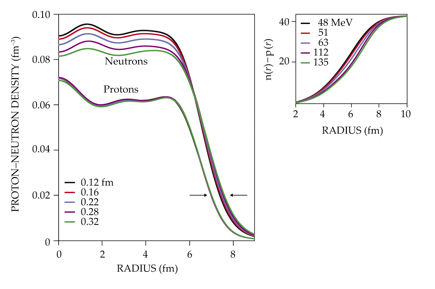 Where do the excess neutrons of lead-208 go? Neutron and proton densities in 208Pb are predicted by various models with differing values for the neutron-skin thickness, as shown in the legend on the left. Displayed on the right is the running sum of neutrons minus protons, which indicates how models with larger values of the symmetry pressure L are more effective in pushing the 44 excess neutrons to the surface.