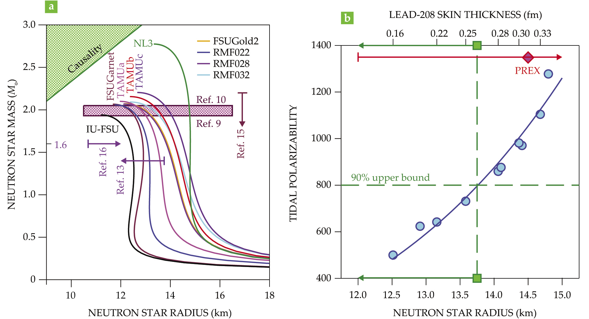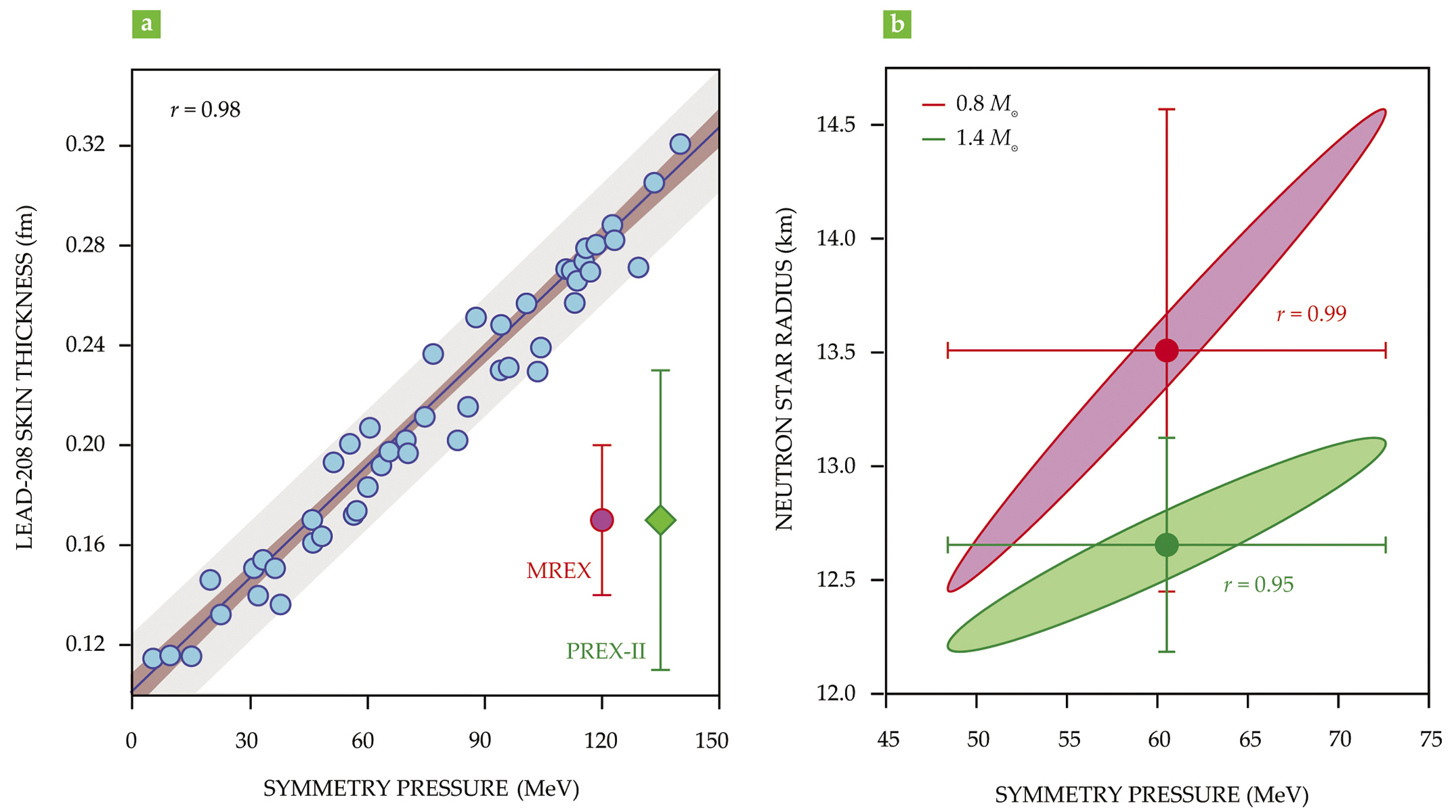 Connecting the very small to the very large. The symmetry pressure L controls both the neutron-skin thickness of lead-208 and the radius of a neutron star despite the difference in size of 18 orders of magnitude. Many successful models illustrate the correlation (a) between L and the neutron-skin thickness of 208Pb. (Adapted from ref.