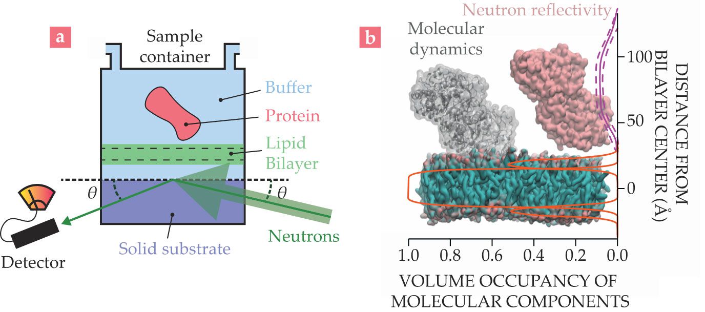 Neutron reflectometry (NR) is performed on thin films of biological materials prepared on solid, flat substrates. (a) A typical NR sample consists of a lipid bilayer with associated biomolecules such as proteins in a fully hydrated environment, typically a sample container that allows in situ buffer exchange. The fraction of the beam scattered as a specular reflection—with equal incident and reflected angles
