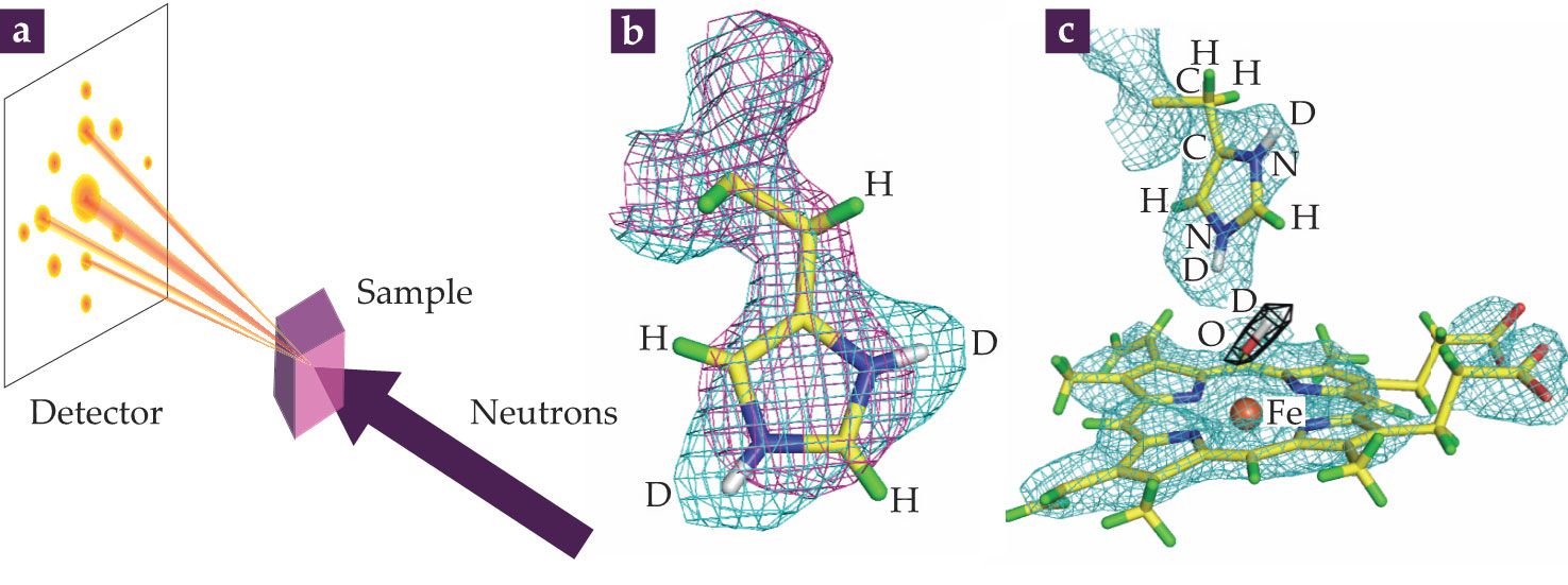 (a) In neutron macromolecular crystallography (NMX), diffraction data, which are observed as reflections, are collected from a deuterated water–soaked protein crystal sample irradiated by a neutron beam. Reflections are transformed into a nuclear scattering density using phase information, which is often obtained from the x-ray crystal structure of the same protein. (b) The purple mesh shows the electron density of a histidine residue; the cyan mesh shows the corresponding density derived from neutron data. The atomic structure is shown as a stick diagram with hydrogen atoms in green and deuterium in white. The non-overlapping cyan mesh indicates the presence of D atoms that can only be visualized using neutrons. (c) A portion of the crystal structure of ascorbate peroxidase (APX) was determined by combining crystallographic data obtained using x rays and neutrons. The stick diagram shows the atomic structure; cyan mesh shows the density from the neutron map surrounding the iron-containing compound (orange sphere) in APX. The black mesh depicts the nuclear density of an oxygen–deuterium chemical intermediate (red and white stick). Studying the interactions of the O–D intermediate with an Fe-containing compound helps uncover how oxidative enzymes function. (Panel a courtesy of David Hoogerheide; panels b and c adapted by Peter Moody at the University of Leicester, UK, from ref.