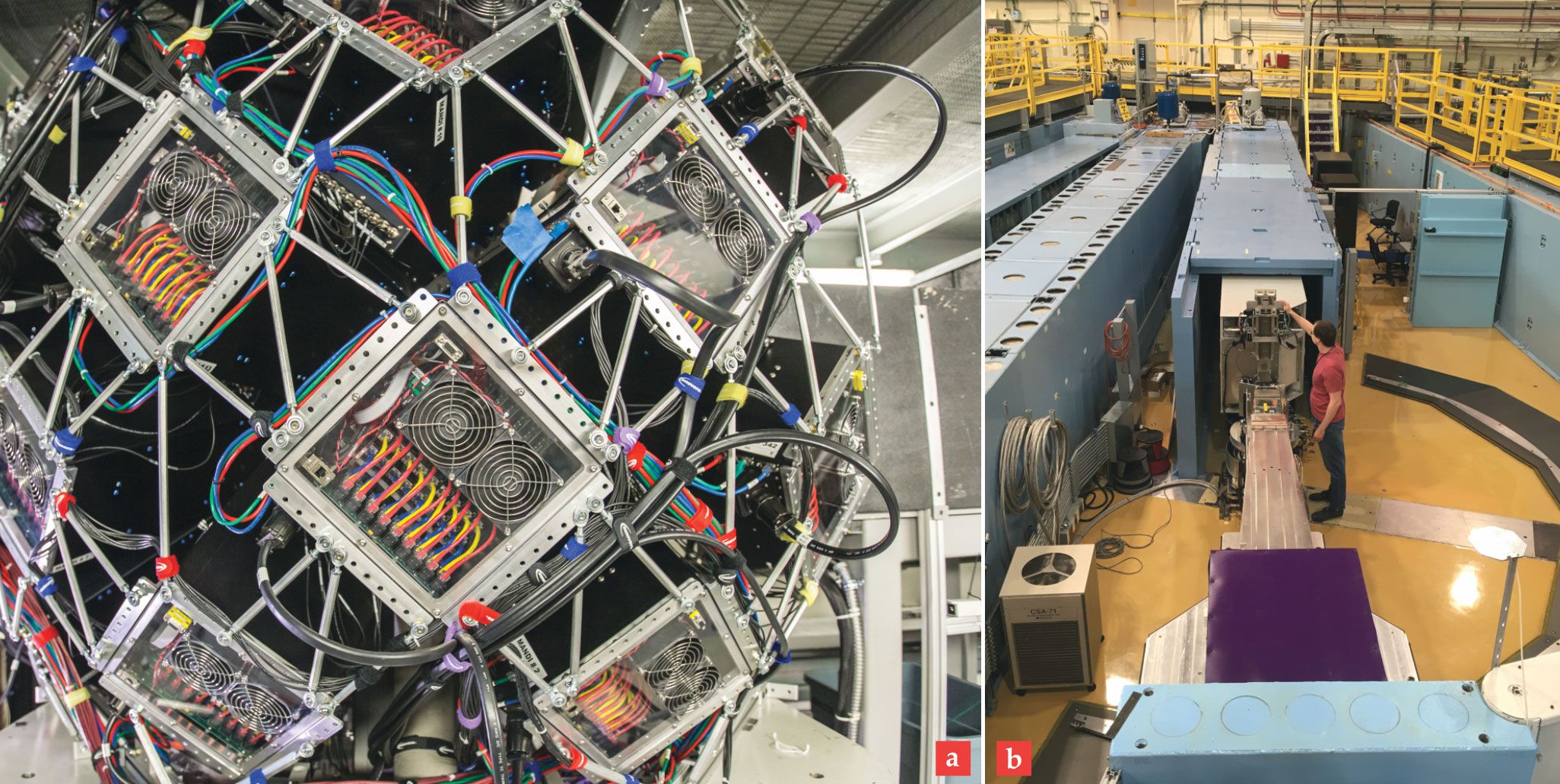 (a) The large metal framework of the Macromolecular Neutron Diffractometer (MaNDi) at Oak Ridge National Laboratory supports numerous scintillation detectors used to collect diffraction data from protein crystals. (b) The new Chromatic Analysis Neutron Diffractometer or Reflectometer (CANDOR) at the NIST Center for Neutron Research in Gaithersburg, Maryland, discriminates between neutron energies using Bragg diffraction with highly oriented pyrolytic graphite analyzer crystals. MaNDi and CANDOR represent a new generation of instruments for collecting neutron data with increased sensitivity and higher throughput.