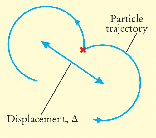 Coulomb Collision. A charged particle gyrates about a magnetic field that is perpendicular to the plane of the paper; a Coulomb collision displaces its gyration to a different, neighboring field line. Most Coulomb collisions cause only small-angle scattering; the associated collision frequency is the rate for a long sequence of weak collisions to accumulate into a single large-angle scattering event. For simplicity, the figure shows this event as if it occurred at a point, marked by an “X,” but the effect is the same: a displacement Δ of the guiding center by a distance comparable to the gyroradius.