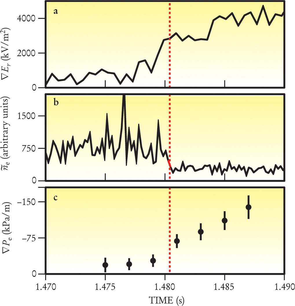 It was soon noticed that the thin region of steep gradients and reduced turbulence—a toroidal annulus only a few centimeters thick, located near the outermost closed magnetic surface—had a strong radial electric field that varied sharply with radius throughout that region, and did not evolve during the high-confinement phase of the various experiments. Such a field—very strong only in a narrow region—in a magnetized plasma necessarily implies a strongly sheared E × B flow of the plasma: The flow can be either toroidal or poloidal and is nearly stationary in time. The experimental data in figure 3 show that the increase in the sheared E × B flow, a decrease in density fluctuations, and an increase in the pressure gradient all occur simultaneously.