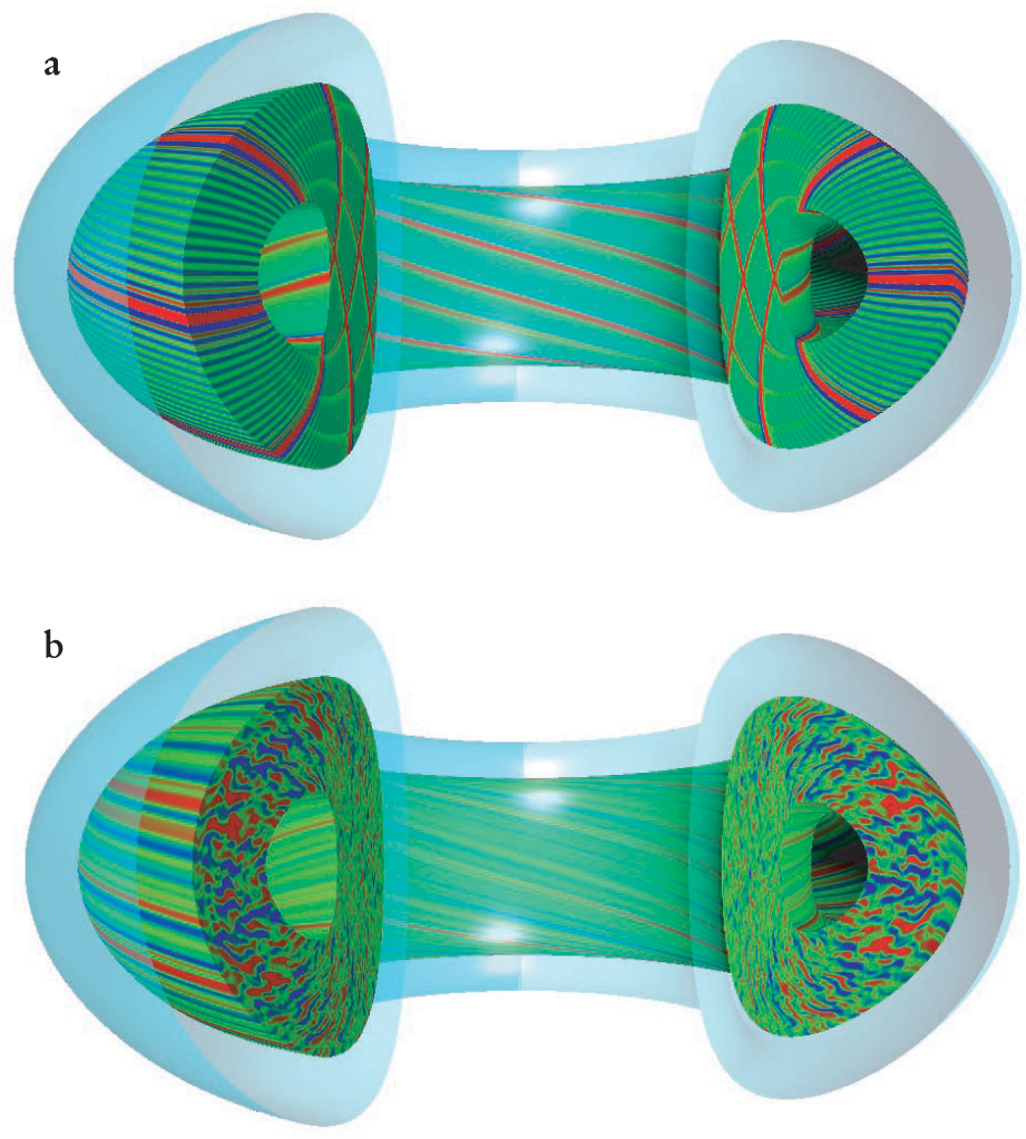 Simulated Electrostatic Potential patterns that arise as a kinetic instability drives plasma turbulence. (a) In an early phase of the instability, driven by a temperature gradient, the equipotential surfaces extend outward along the plasma radius, implying a poloidal electric field component; the corresponding E × B drifts would rapidly carry particles out of the confinement region. The equipotentials are also aligned with the confining magnetic field, but that effect is harmless, because the field lines are confined to magnetic surfaces. (b) In a later phase, a naturally induced shear flow has broken the radial correlations and left only a random structure with little radial extension. The result is improved confinement.