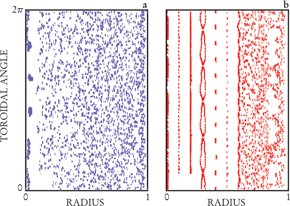 Magnetic Field Puncture Plots for a simulated plasma confined by a weak magnetic field. Each point is the intersection of a field line with a horizontal plane (the toroidal-radial plane). (a) The field is seen to wander chaotically over the cross section due to magnetic-field turbulence. A rapid loss of energy ensues. (b) The turbulence is reduced by controlling its energy source (in this case, the gradient in the plasma current density). Well-ordered magnetic surfaces form that inhibit energy transport.
