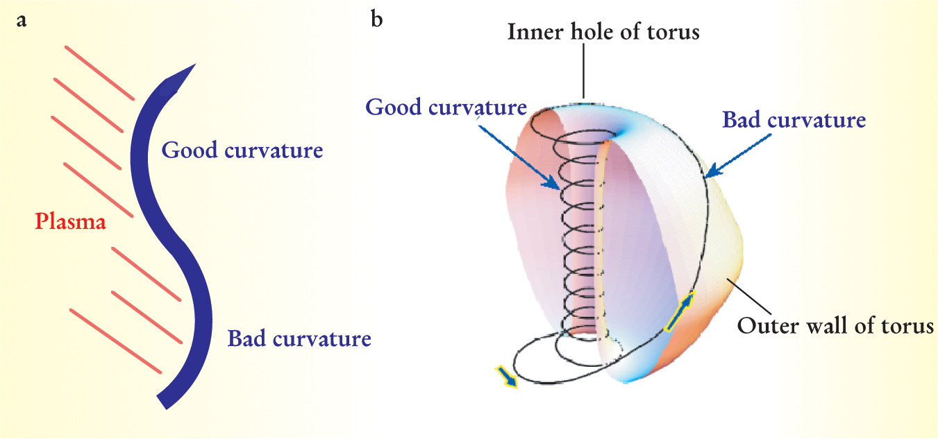 The most common form of pressure-driven instability is a magnetic analog to the well-known gravitational Rayleigh-Taylor instability that occurs when a heavy fluid rests on a lighter one. The gravitational force is negligible for laboratory plasmas, but the centrifugal force that particles experience as they move along a curved magnetic field acts like an effective gravitational force. The effective gravity is destabilizing if the magnetic field curvature is convex from the viewpoint of the plasma (figure 6(a)). If the curvature is concave, the effective gravity is stabilizing. In a plasma with a strong toroidal magnetic field, the curvature is mainly determined by that of the toroidal field. As a particle moves along a helical field line, it moves through a region of unfavorable destabilizing curvature on the large major radius side of the plasma, and a region of favorable curvature on the inner side. In a sense, the particles perform an averaging of the curvature, which ultimately determines the pressure limit.