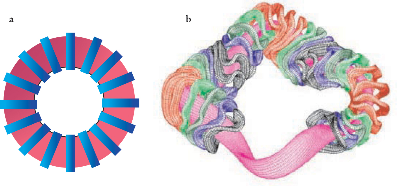 Magnet Configurations, simple and complex. (a) Solenoidal magnetic field coils (blue) surround plasma (red) that is symmetric in the toroidal direction. This most common form of toroidal confinement is simple, but requires a toroidal plasma current to produce the full, confining helical magnetic field as shown in figure