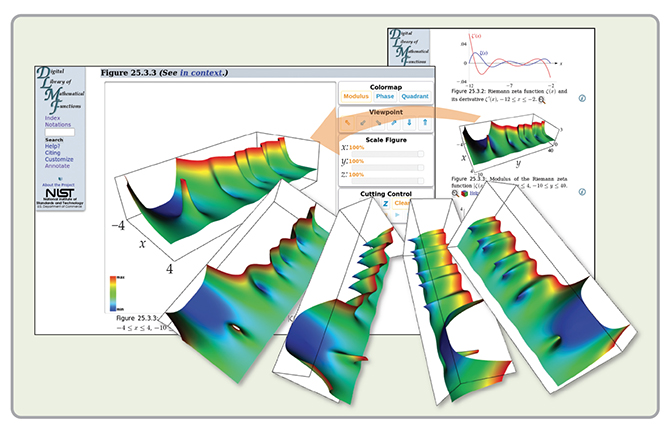 Interactive visualizations in the Digital Library of Mathematical Functions (DLMF). The complex shape of the modulus of the Riemann zeta function |ζ(x + iy)|, an important function in number theory, quantum field theory, and other areas of mathematics and physics, illustrates the difficulty in displaying key features of a function surface with a single static image. The DLMF allows users to rotate a function surface in any direction and manipulate it with other tools to explore it. Clicking on the static image of the Riemann zeta function in one webpage (top right) opens a new page (top left) containing an embedded figure with control side panels. The original static image shows the simple pole at x = 1, y = 0, but obscures the nontrivial zeros on the critical line at x = 0.5, where the Riemann hypothesis asserts they lie. Such visualizations were designed using WebGL-based technology, which lets one view the graphics on different platforms without downloading a special browser plug-in.4 (Adapted from DLMF screenshots. See chapter 25, “Zeta and Related Functions,” for more information.)