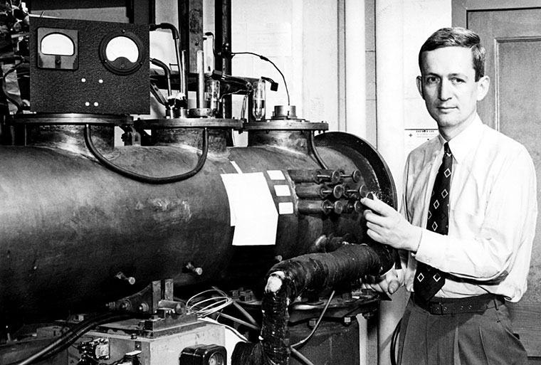 After “two or three days of thinking,” Norman discovered an analogy with his apparatus. If he used a short coil to apply an oscillating field as the atoms enter the magnetic field and a second short coil to apply an oscillating field as they exited the magnetic field, the spectral line would be almost twice as sharp as if the oscillating field were applied over the entire path using a single long coil. The photo on page 25 shows Norman in Harvard University’s molecular-beam laboratory in 1952 standing next to the apparatus that first employed his new resonance method. (For a simple description of the method, see his July 1980Physics Today article reprinted in this issue on page 36. A technical description is in his journal articles and classic text cited in reference .)