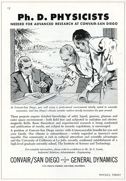 Faced with bankruptcy, the main character of Ira Wallach’s novel The Absence of a Cello contemplates becoming an industrial physicist. This ad appeared in Physics Today’s April 1959