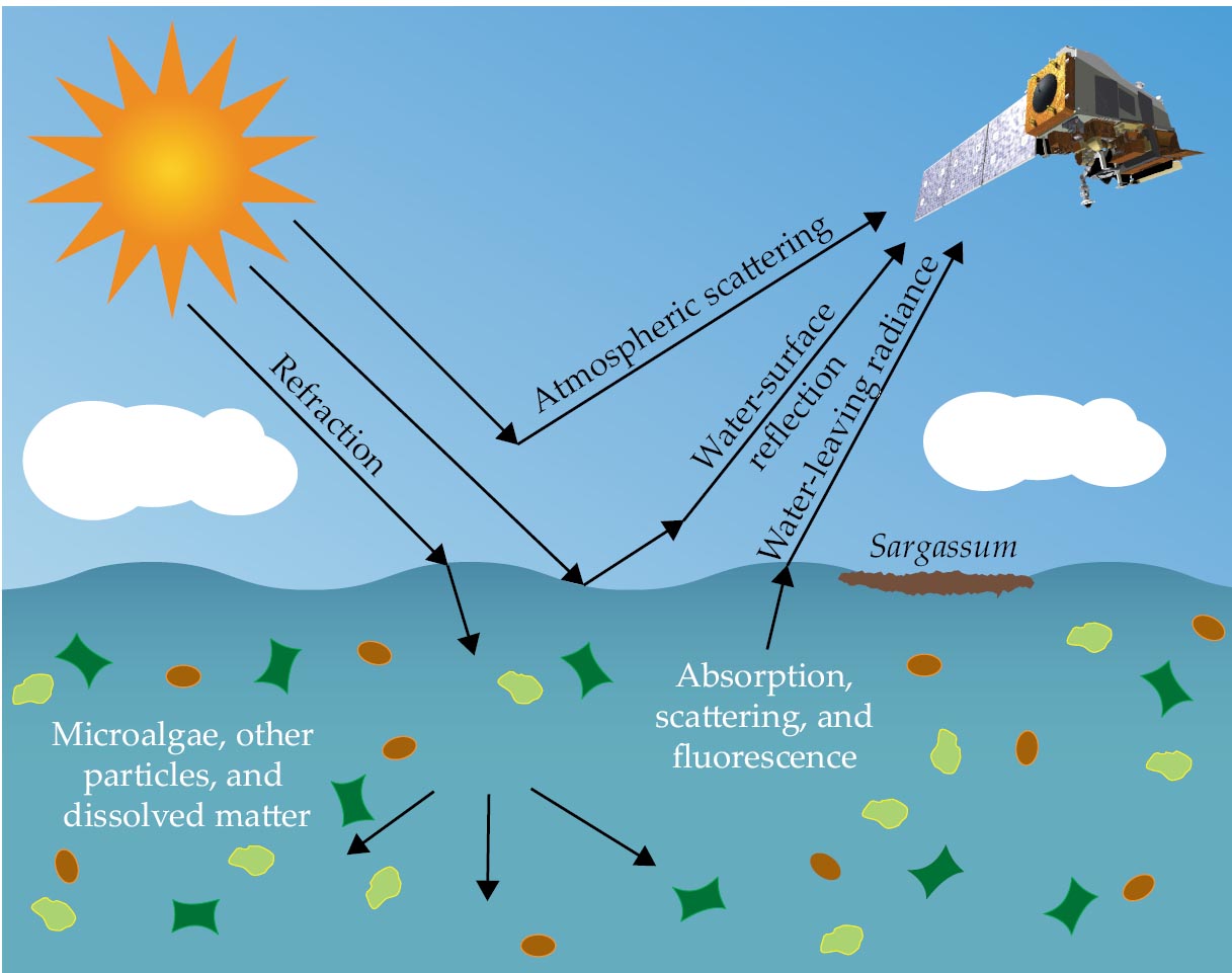 The history of ocean color remote sensing goes back to the pioneering works of many individuals. 14 Since 1978, when the proof-of-concept Coastal Zone Color Scanner was one of eight instruments aboard the Nimbus-7 spacecraft, modern satellite sensors specifically designed to measure reflected sunlight have been equipped with more spectral bands, better signal-to-noise ratios, and finer spatial resolutions. Recent missions also allow for more frequent revisits to the same area. The satellite-derived surface reflectance measurements produce unprecedented data to study not only light penetration in the ocean but also, through the use of inversion algorithms, properties of microalgal particles and macroalgal mats.
