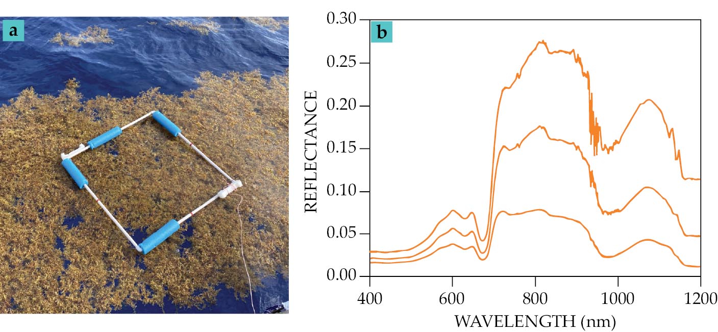 Measuring Sargassum mats in the Gulf of Mexico. (a) The biomass density is determined by weighing the collected Sargassum and using a reference quadrat, here 1 m on a side, to determine the size of the collected Sargassum. (Courtesy of Samuel Bunson.) (b) The mat’s spectral reflectance is measured using a handheld spectrometer pointing at the mat. Differences in magnitude are primarily due to how much Sargassum (that is, biomass density in kilograms per square meter) is captured in the spectrometer’s field of view. The relationship between reflectance and density is used to develop algorithms to calibrate and validate space-based measurements, which provide only reflectance data.