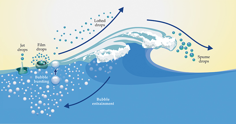 Sea spray, which consists of liquid drops that are ejected from the ocean surface, takes part in a rich variety of physical and chemical processes. Small droplets are often lifted high into the atmosphere and can remain there for several days; their actual time aloft depends on such atmospheric conditions as wind speed, air turbulence, and precipitation. And once airborne, the drops can evaporate entirely to leave behind sea-salt aerosols that may then act as cloud condensation nuclei, scatter or absorb solar radiation, or influence atmospheric chemistry. Current estimates of the global release of salt from the ocean via sea-spray production range between 2 billion and 20 billion metric tons per year. 2 That’s enough to cover the city of Houston, Texas, with up to 6 m of salt every year.