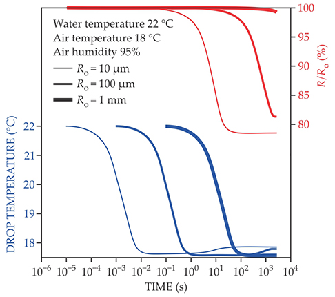 As we’ve seen, droplets smaller than 50 µm or so can remain airborne for days because of their low inertia; large ones remain aloft for mere seconds. The difference matters because the time it takes a droplet to cool is substantially shorter than the time it takes to evaporate, as shown in figure 3. The disparities in droplet lifetimes, temperature evolution, and size evolution produce a complex physical picture. For example, despite not carrying much mass, smaller droplets may possess a greater capacity to transfer latent heat to the atmosphere because of their longer time aloft. Any modeling scheme designed to predict the fate and feedback of spray droplets must therefore account not only for the detailed processes controlling the velocity, size, and temperature of each droplet but also for the meteorological conditions that control its suspension time.