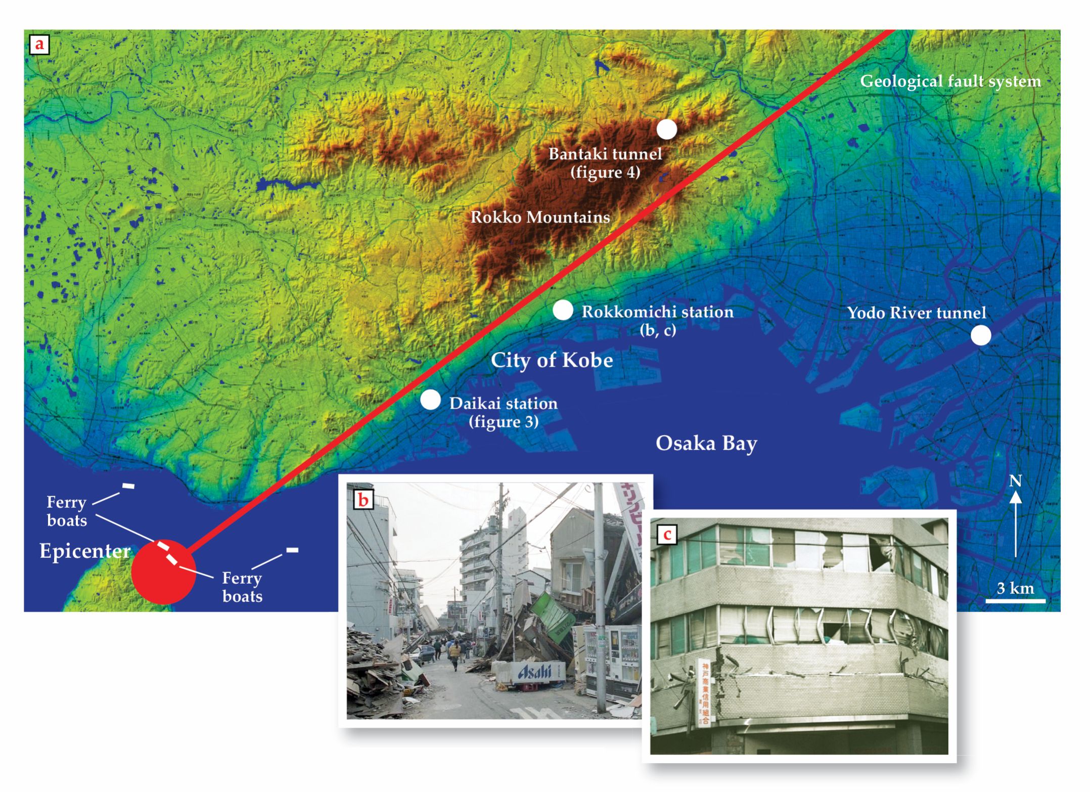 On 17 January 1995, a devastating earthquake struck the port city of Kobe in southern-central Japan and the densely populated surrounding area. The quake, officially named the Hyogo-ken Nanbu earthquake, had a moment magnitude of 6.9. The seismic rupture initiated at a shallow depth of 16 km and propagated to the northeast and southwest along the crust’s local geological fault system (figure