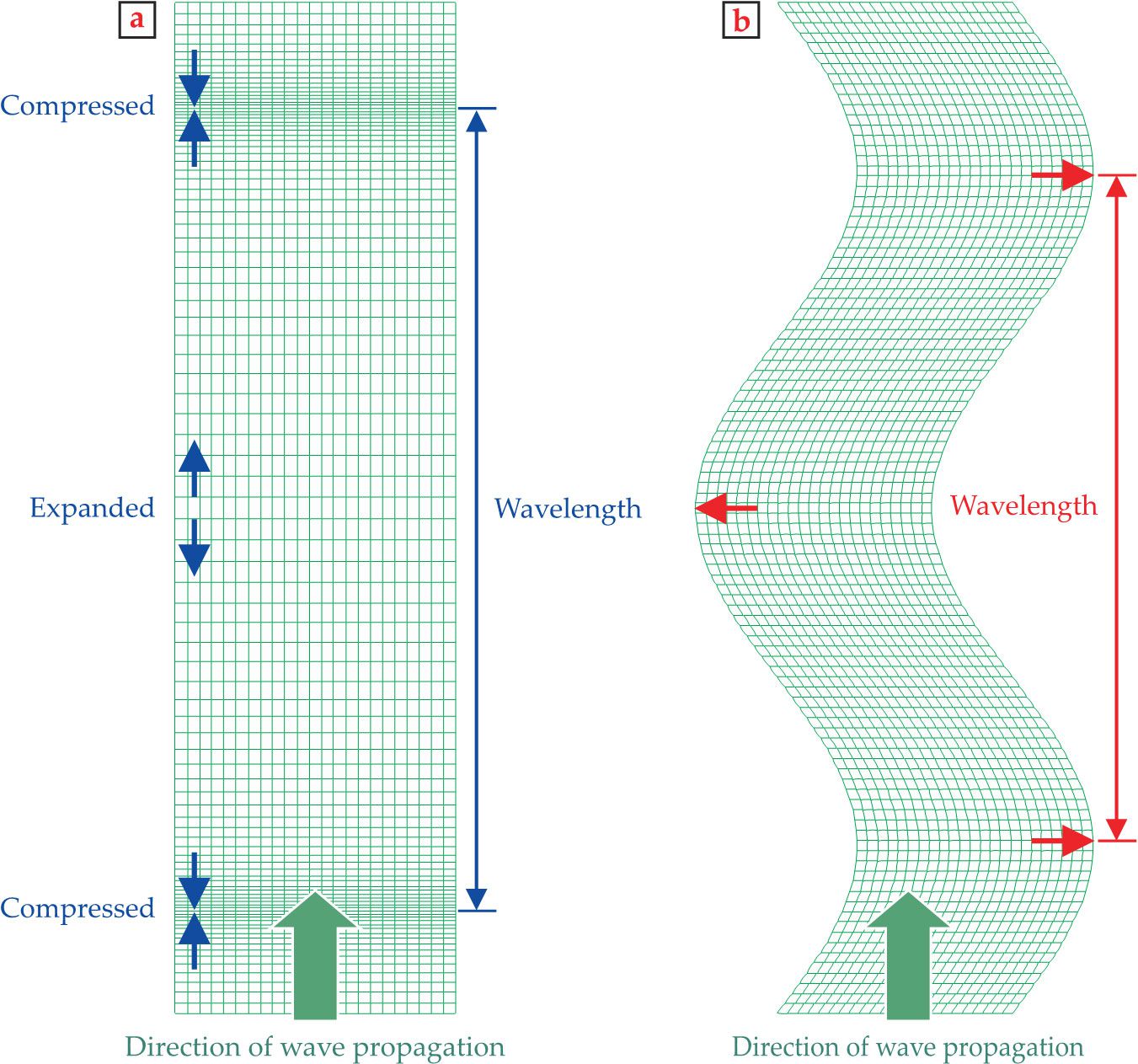(a) A longitudinal (P) wave moving through a solid medium generates compressive and extensional motions that cause local volumetric changes in the medium. The wave moves at a constant speed through the medium. (b) A shear (S) wave, which travels at a constant speed smaller than that of a P wave, produces transverse or shearing motion that doesn’t cause volumetric change.