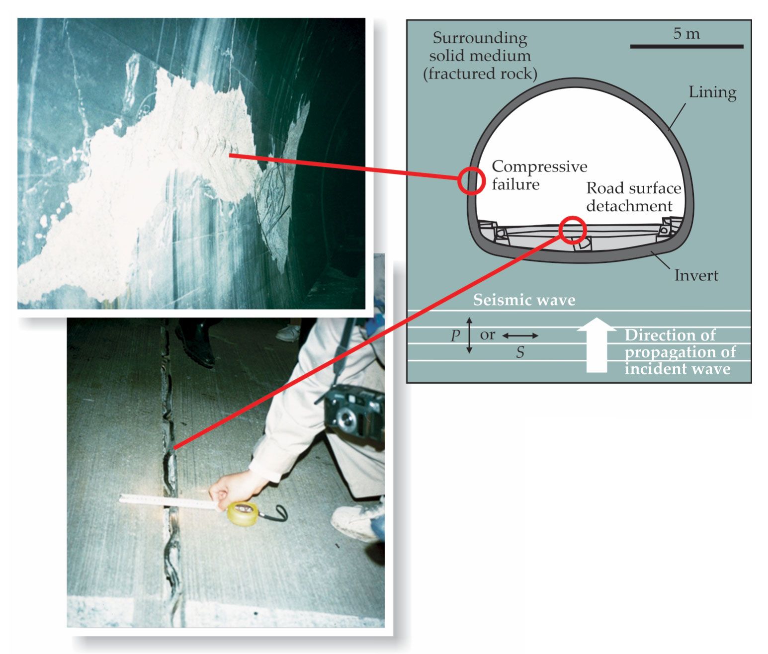 The Bantaki tunnel experienced unfamiliar structural damage during the Hyogo-ken Nanbu earthquake. A high-frequency P wave impinging on the tunnel could have caused vertical shaking that dynamically compressed the tunnel and caused the failure observed in Bantaki—namely, the fracture of the concrete wall and the detachment of the road from the tunnel’s underlying concrete. An S wave with horizontal vibration could not have produced the necessary compressive force in the tunnel’s wall. (Photographs courtesy of Shunsuke Sakurai, Kobe University.)