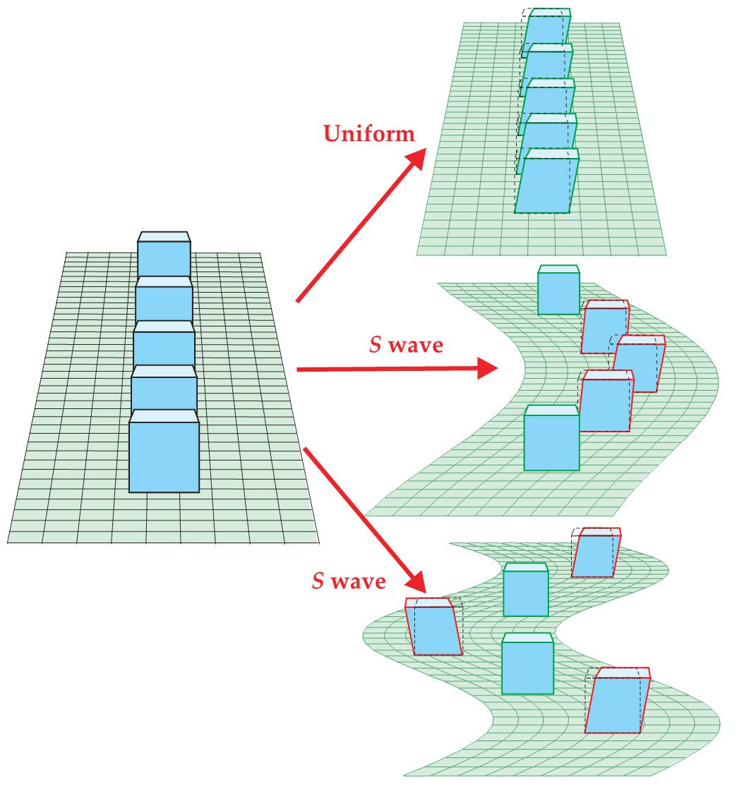 A 1976 earthquake in Friuli, Italy, produced a periodic structural failure pattern in adjacent, mechanically similar buildings. (H. P. Rossmanith, Vienna University of Technology, Austria.) Figure 6. The town effect challenges the conventional idea that earthquakes generate rigid-body shaking of unbending ground. Uniform shaking (top right) should cause the same level of vibration and damage to mechanically identical buildings; it can’t generate the alternating failure pattern in the opening image. However, S waves propagating through a densely built town can deform the ground and deliver dissimilar vibrations and damage to identical buildings (center and lower right). The frequency of the vibration determines the damage pattern. (Adapted by Donna Padian from the author’s original.)
