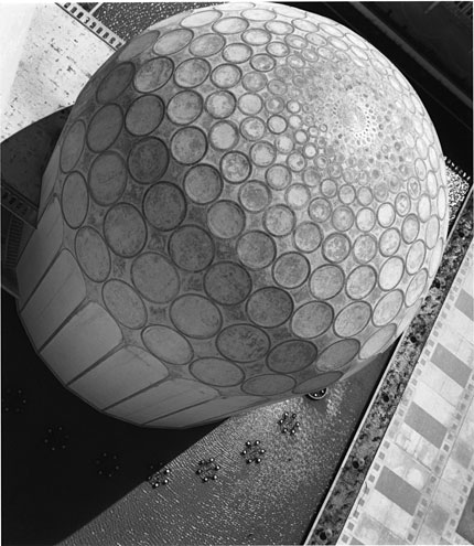 As the opening sketch on pages 40–41 shows, Stone put the reactor itself at the center of his design—literally and symbolically. The reactor’s swimming pool and shielding had to meet AEC standards, of course, as did the hot cells, gamma and x-ray rooms, and other special facilities. Yet even after accommodating a 10-ton gantry crane to move the reactor core to different experimental windows, Stone found plenty of room for architectural improvisation. Instead of exposed concrete, he finished the thin-shell dome with waterproof stucco in an ornamental arrangement of slender rounded arches capped by concentric rings of circles. He then elaborated the arches and circles with embedded gold mosaic tiles (see figure 2). In the moat around the base of the reactor dome, Stone arranged fountains and spotlights, to eye-catching effect. The slender tower rising 250 feet, about twice the height of the dome, doubled as a water storage tank and exhaust stack for the reactor. Resembling a minaret standing aside the mosque-like dome, the tower showcased polished convex walls with a repeating pattern of concrete blocks. At the top, the walls flared upward, a perfect complement to the circular motifs of the dome.