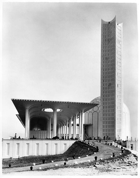 Figure 3. A laboratory of the Pakistan Institute of Nuclear Science and Technology can be seen to the left in this image, taken while the institute was under construction. Graceful columns support a canopy that protects from the harsh sun but also includes transparent domes for light. The reactor dome and its soaring exhaust tower lie to the right. (Courtesy of Edward Durell Stone Papers, Special Collections, University of Arkansas Libraries, Fayetteville.)