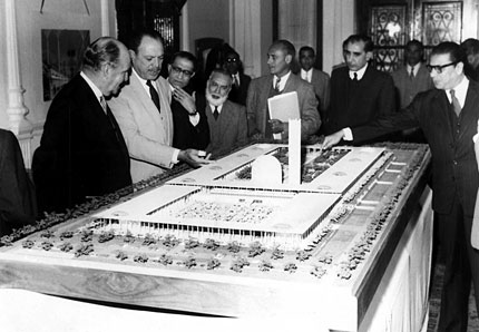 Figure 4. Architect Edward Durell Stone (left) presents the finished model for the Pakistan Institute of Nuclear Science and Technology to Pakistan president Ayub Khan (in light suit) and I. H. Usmani (to the right of Khan), head of the Pakistan Atomic Energy Commission. (Courtesy of Edward Durell Stone Papers, Special Collections, University of Arkansas Libraries, Fayetteville.)
