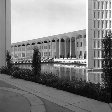 Structurally, Stone supported the buildings with a forest of reinforced concrete columns that flared at the top into delicate tree-like forms. Arranged in parallel rows, the columns, as seen in figure 3, permitted the roof slab to be extended on each side of the laboratory buildings to provide shade from the intense sun. Straight on, those columns framed graceful arches. Stone’s incorporation of a hidden double roof between the roof and ceiling allowed for natural air circulation and cooling and for another floor of laboratories to be added in the future at minimum cost. Above the auditorium and the library, and above the breezeways between laboratories, large transparent domes broke the monotony of the concrete canopy and illuminated the courts between the buildings.