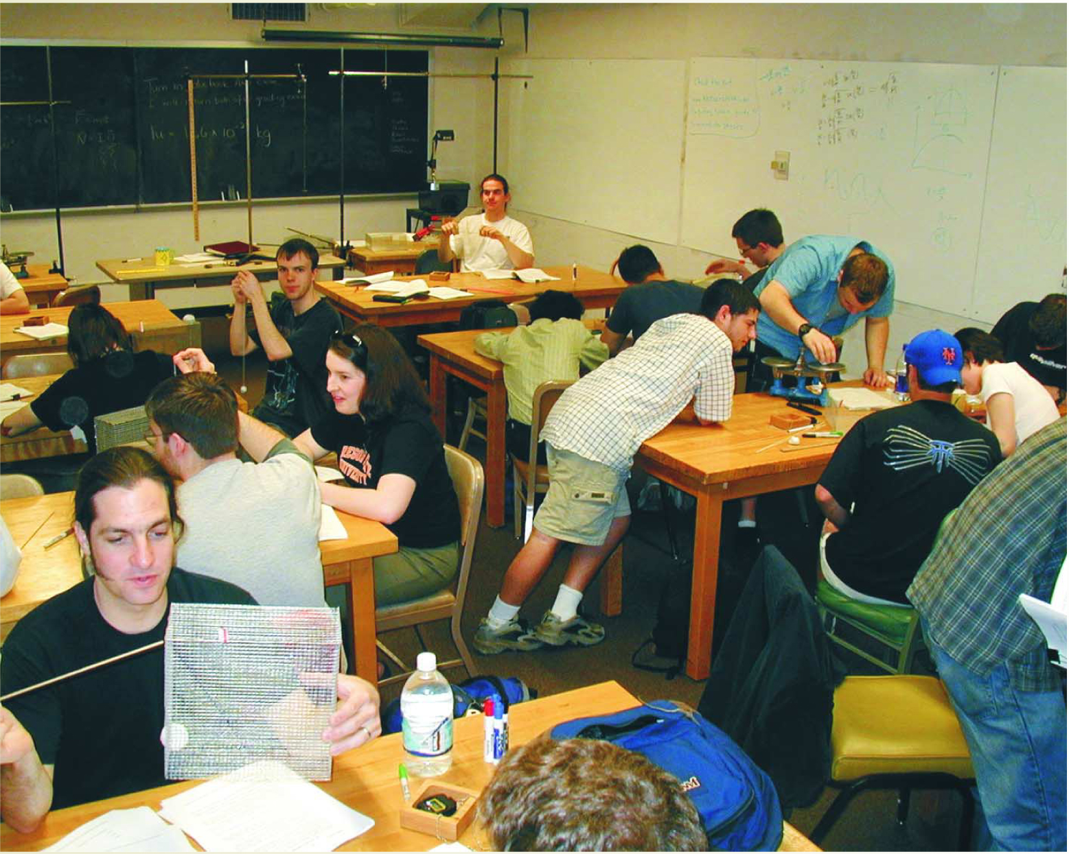 Figure 2. The paradigms classroom. Students are working on a project in the rigid-bodies paradigm to understand the rotational behavior of an asymmetric object. They are constructing such an object by attaching lumps of clay to various locations on a wire cage. When they have finished, quick swiveling of the chairs converts the classroom from lab to lecture. After class, students will reclaim the space as a study area and lounge.