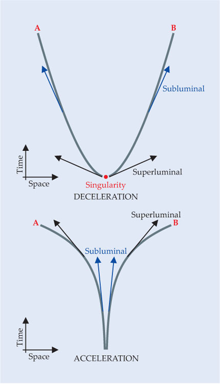 Figure 1. In an expanding universe, the distance between two separated points increases over time, simply due to the expansion of the space between them. The two panels here show the spacetime trajectories of two points, A and B. For the decelerating expansion illustrated in the top panel, the separation rate is greater in the past and even exceeds the speed of light at sufficiently early time. Thus A and B go from being out of causal contact—unable to influence each other—to being in causal contact. In an accelerating cosmos, the separation rate is smaller in the past; the two points go from being in causal contact to being out of causal contact. In the inflationary universe scenario, an early epoch of acceleration—the inflationary era—smoothly maps onto a long period of deceleration. Thus two points can go from being in causal contact to out of causal contact and, much later, back into causal contact. (Courtesy of Marius Millea.)