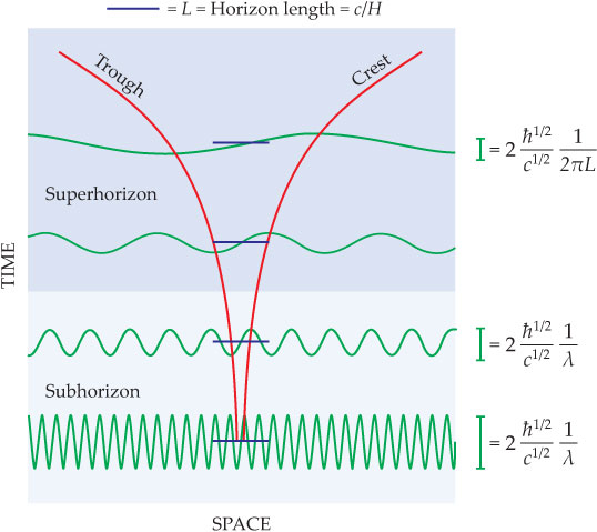 Figure 2. Fluctuations in the value of the inflaton field, which is responsible for the accelerating expansion of the cosmos, evolve differently, depending on whether their wavelength λ is less than or greater than the horizon length L = c/H. (Here c is the speed of light and H is the Hubble parameter.) When λ ≪ L, the expansion (red) smooths out the field, but the quantum uncertainty principle limits how smooth the field can be. As a result, the amplitude of the fluctuation is inversely proportional to λ and thus decreases as the universe expands. (The influence of the uncertainty principle is reflected by the appearance of Planck’s constant ℏ in the expression for the amplitude.) As λ becomes larger than the horizon, the crest and trough of the wave cease to be in causal contact, so the amplitude stops evolving. For superhorizon evolution, its asymptotic value corresponds to replacing the wavelength in the subhorizon case with 2πL. Eventually, cosmic expansion stretches the fluctuations to astrophysically large length scales.