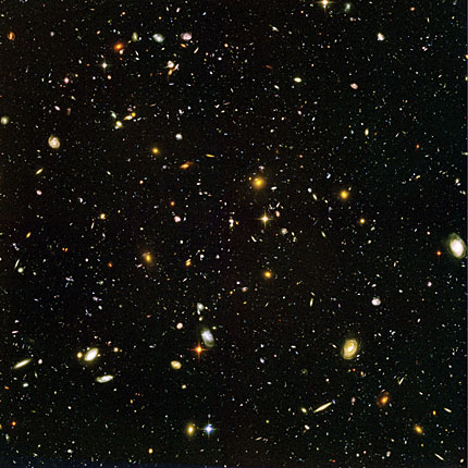 Figure 3. The Hubble Ultra Deep Field image looks back as much as 13 billion years. This image, from the Hubble Space Telescope, is approximately 3 arcminutes on each side. (Courtesy of NASA and the Space Telescope Science Institute.)