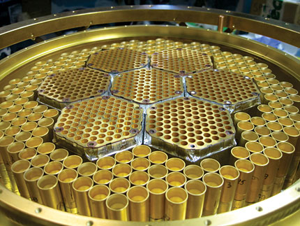 This honeycomb-like array of feedhorns at the 10-m South Pole Telescope directs radiation to superconducting detectors used to measure the polarization of the cosmic microwave background. The seven hexagonal cells in the center, about 5.8 cm across, are sensitive to radiation at frequencies of about 150 GHz. The larger feedhorns surrounding them are used for frequencies near 95 GHz. Progress in detector development is so rapid that within a year arrays should have sensitivities an order of magnitude greater than that of the state-of-the-art detector shown here. (Courtesy of the South Pole Telescope.)