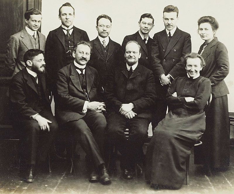 Figure 1. Paul and Tatiana Ehrenfest, seated at the ends of the front row in a gathering at their home in Saint Petersburg, Russia, circa 1910. Most of the group are colleagues from the city’s Polytechnic Institute. Seated next to Paul is his friend, theorist Abram Ioffe. (Courtesy of the Boerhaave Museum.)