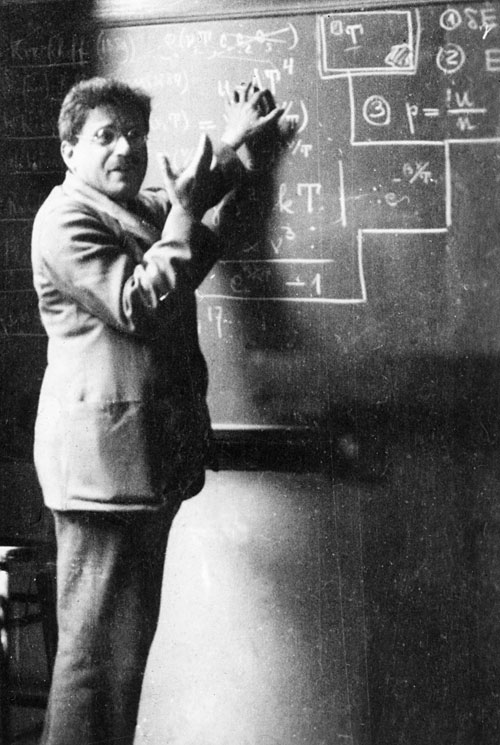 Figure 3. Paul Ehrenfest lecturing in Ann Arbor, at the University of Michigan’s 1930 physics summer school. (Photo by Samuel Goudsmit, courtesy of the AIP Emilio Segrè Visual Archives.)