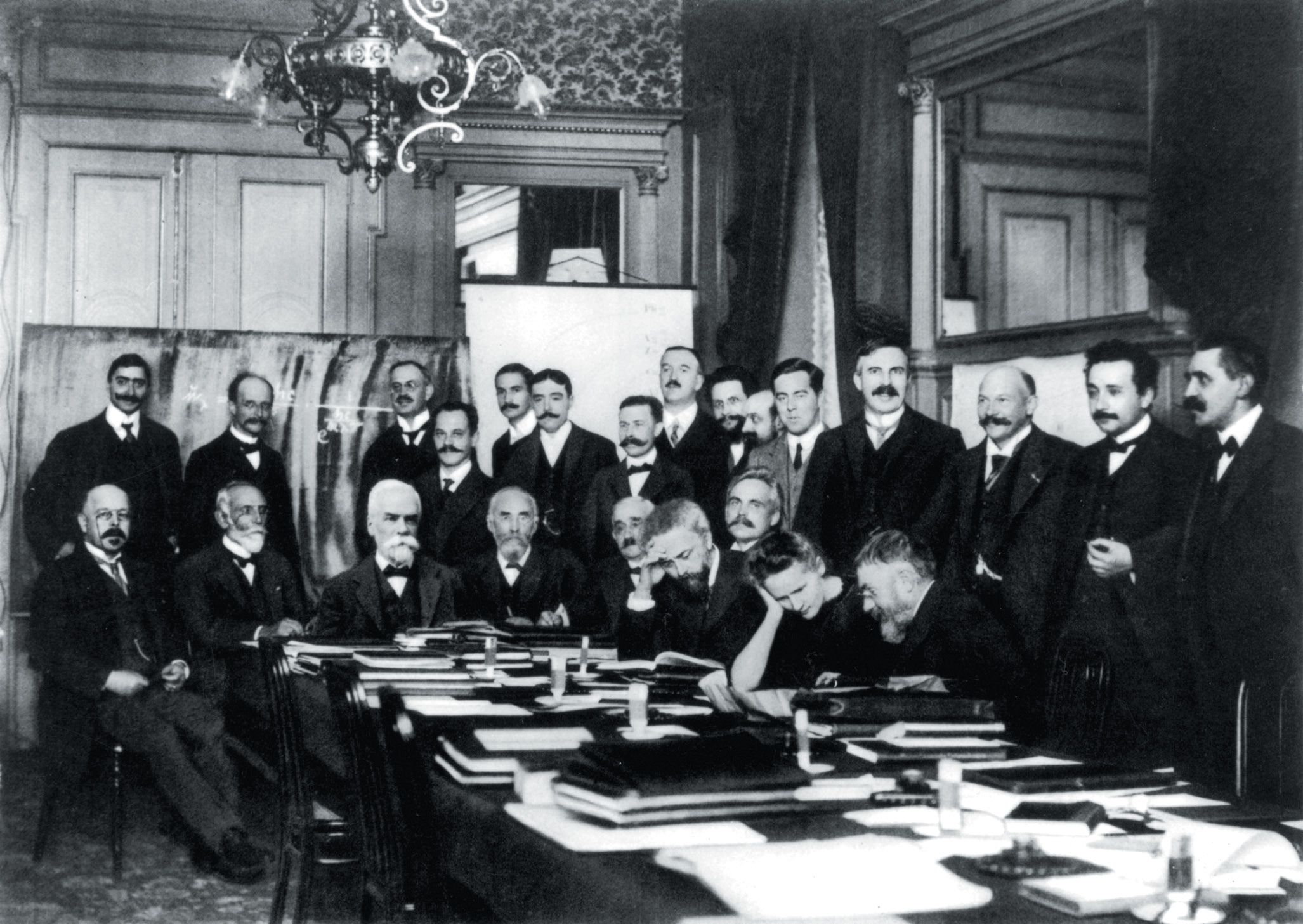 The attendees at the first Solvay Conference on Physics, which took place in Brussels from 30 October to 3 November 1911. Paul Langevin stands farthest to the right; next to him is Albert Einstein. (Photograph by Benjamin Couprie, public domain.)