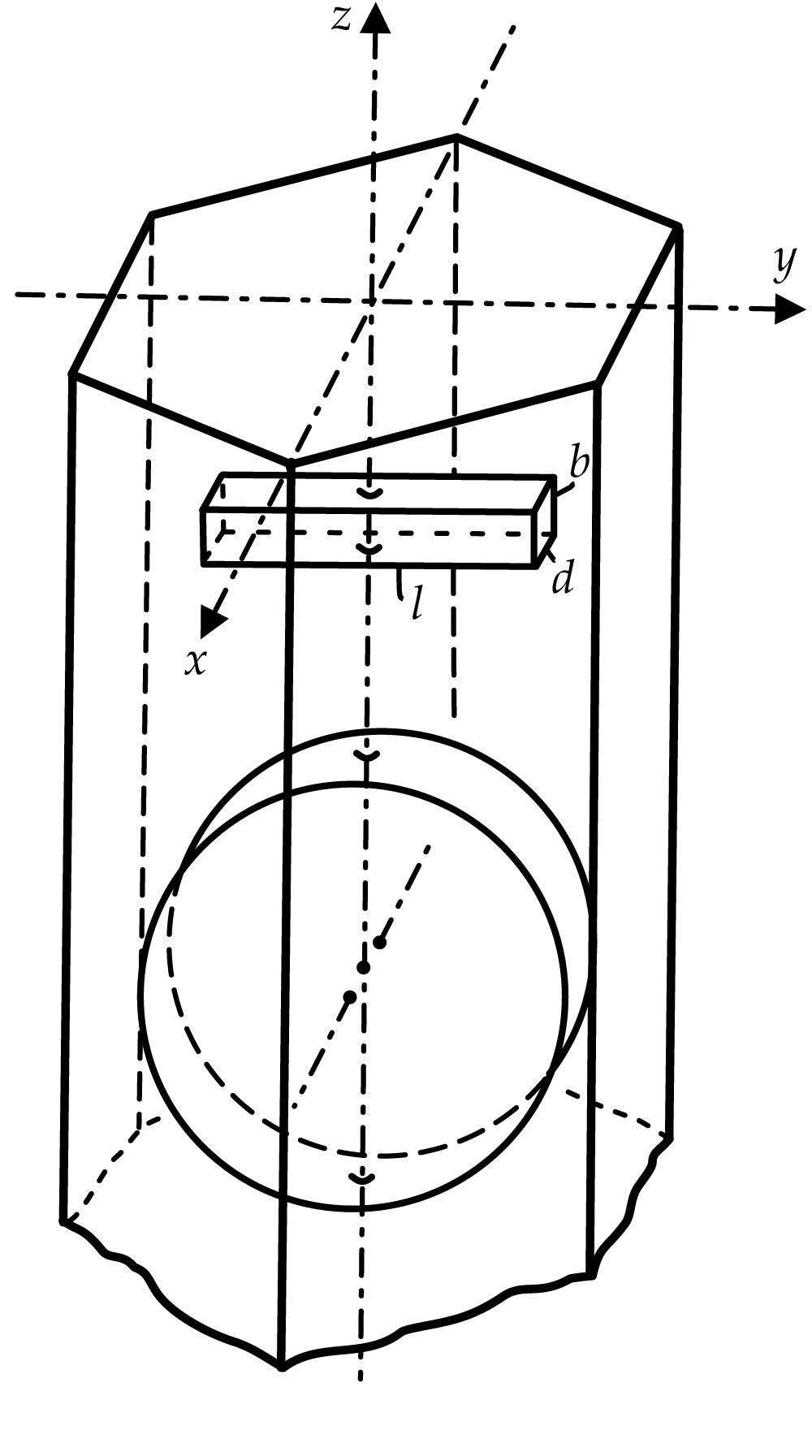 A diagram of x- and y-cut quartz. The cylinder at the bottom of the crystal is an x-cut plate of the type employed by Paul Langevin in his quartz transducer. The rectangular prism, l × b × d, on the other hand, is a y-cut plate. (Adapted from E. Hiedemann, Grundlagen und Ergebnisse der Ultraschallforschung [Principles and Results of Ultrasound Research], Walter de Gruyter, 1939, p. 4.)