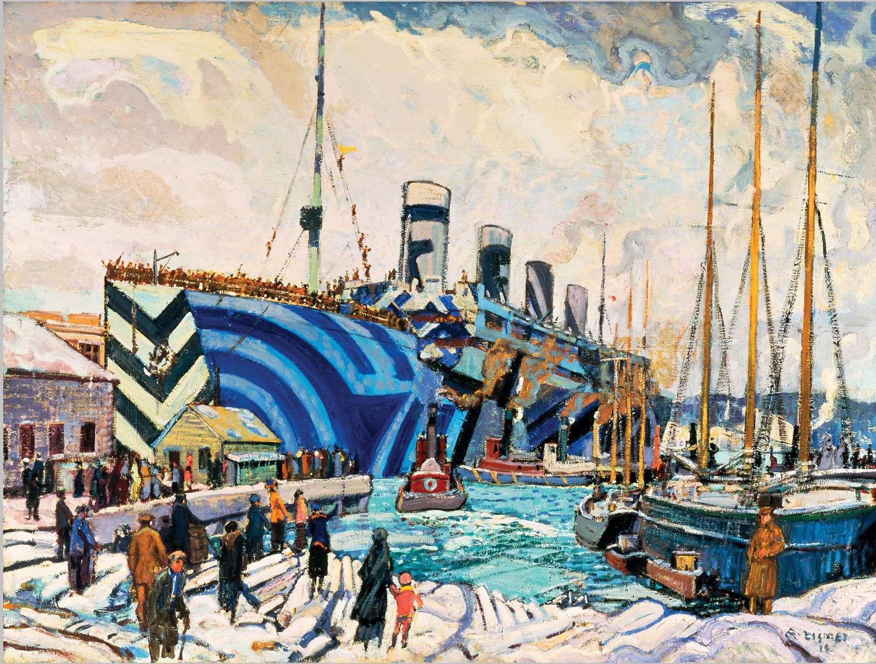 Dazzle camouflage was used by the Allies during World War I in an attempt to make it difficult for German U-boats to detect a target ship’s position and speed. Arthur Lismer’s 1919 painting Olympic with Returned Soldiers depicts the Olympic (the Titanic’s sister ship) in dazzle camouflage at a dock in Halifax, Nova Scotia. (Courtesy of the Canadian War Museum, public domain.)