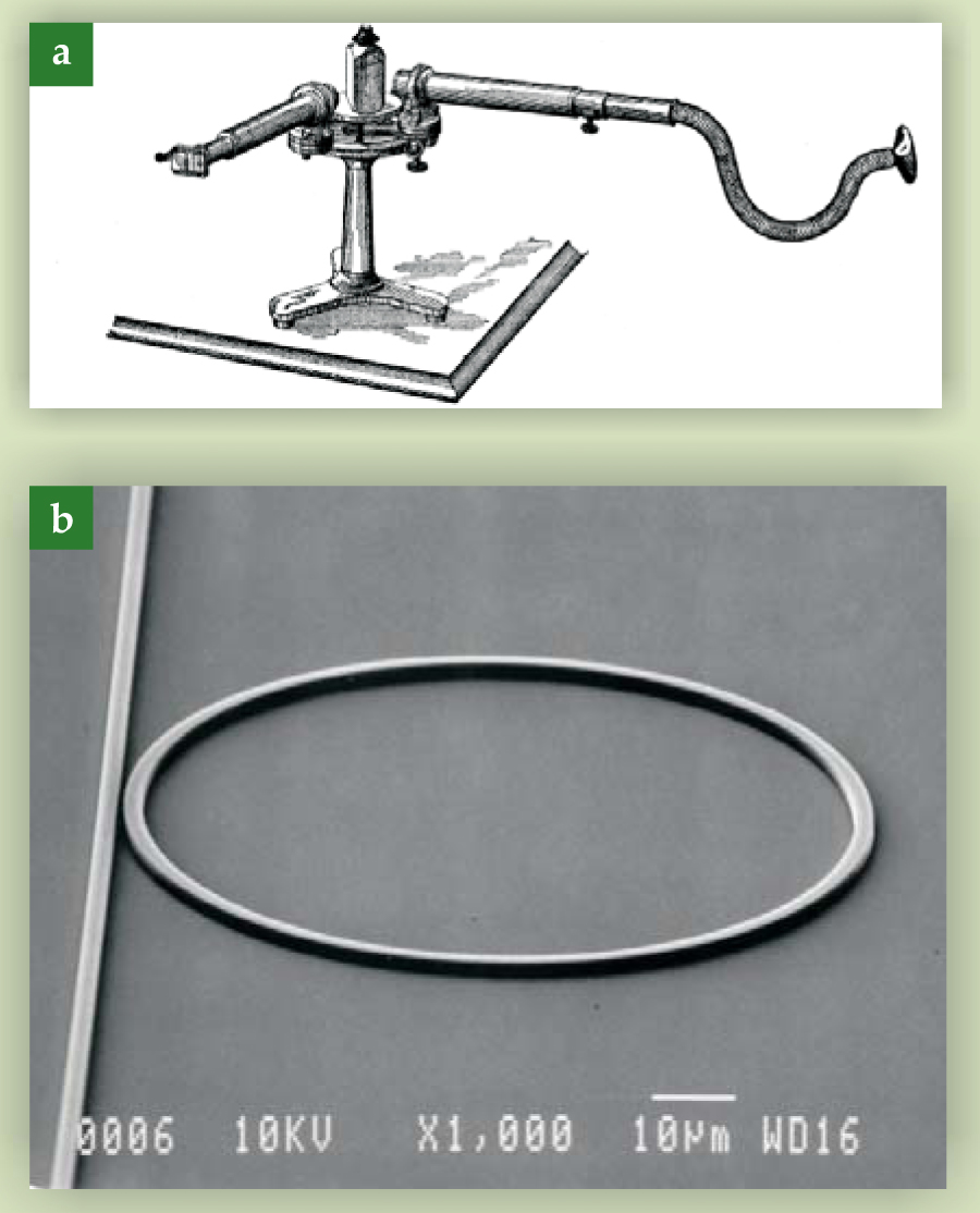 Figure 1. (a) Using a device called a spectrophone, Alexander Graham Bell demonstrated that light can generate sound. The rotating object in the middle absorbs energy from a focused beam of light. The resulting time-modulated thermal expansion can be detected with a stethoscope. (b) A waveguide ring resonator uses light to detect sound. Light is coupled from the straight waveguide on the left into the micro-ring when its effective wavelength is an integral fraction of the ring circumference. Acoustic waves distort the waveguide dimensions and alter the observed resonance spectrum.