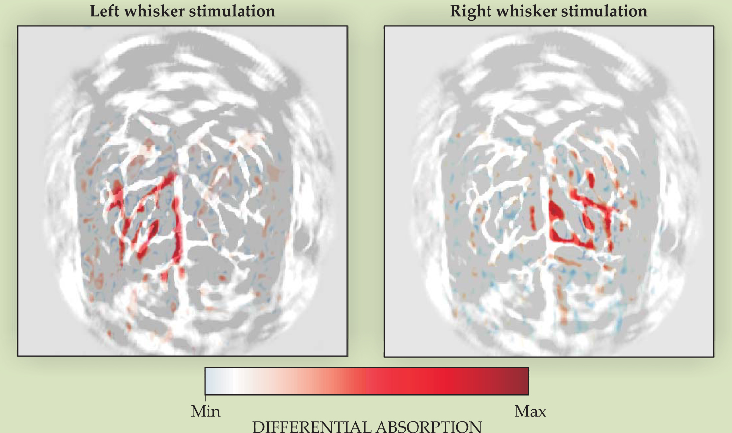 Figure 2. Photoacoustic images showing oxygen utilization in the brain of a rat when its whiskers are stimulated. Each panel shows the differential absorption between the unstimulated brain and the brain during left or right whisker stimulation. The images were taken at a wavelength at which the optical absorption spectra of oxygenated and deoxygenated hemoglobin differ, so the regions of high differential absorption indicate regions of oxygen utilization.