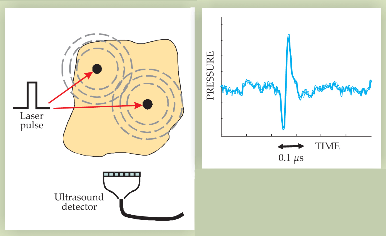 Figure 3. Photoacoustic generation and detection. Black dots in the left panel represent regions of high optical absorption. When heated by a laser pulse, they launch acoustic waves, which are picked up by an ultrasound detector. The ultrasound waveform shown in the right panel is approximately proportional to the time derivative of the optical pulse.