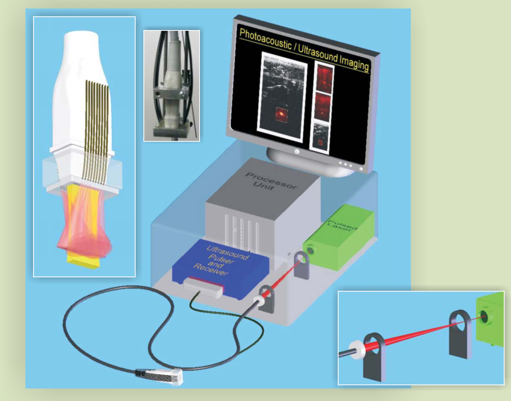 Photoacoustic imaging is such a technique. It was first proposed as a medical imaging modality nearly 30 years ago by Theodore Bowen at the University of Arizona. 5 Subsequent work by Alexander Oraevsky, 6 Robert Kruger, 7 Lihong Wang, 8 and others has built on recent advances in pulsed laser technology to produce photoacoustic images with the same high spatial resolution achieved by ultrasound imaging.