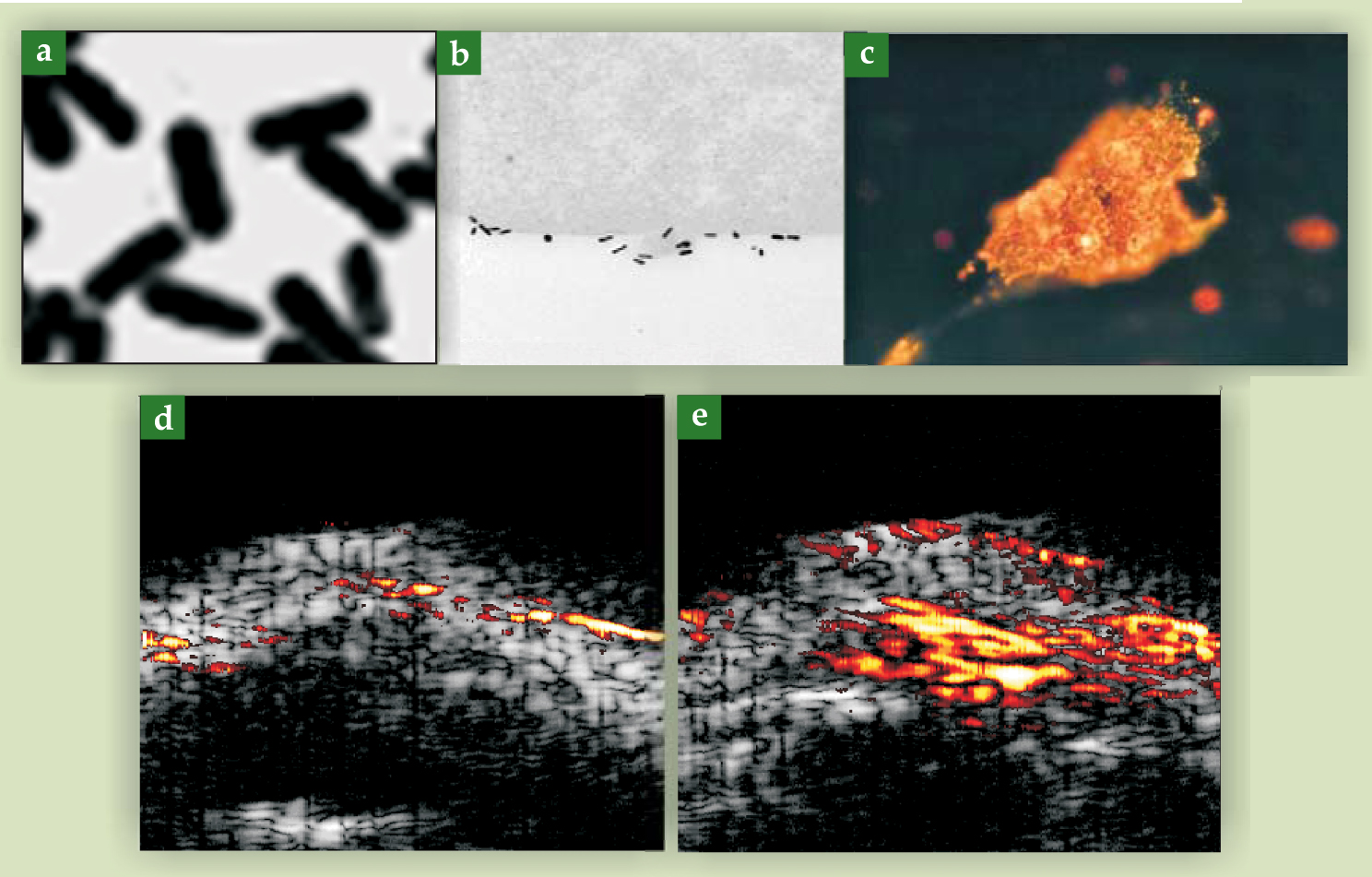 Figure 5. Transmission electron microscopy images of gold nanorods: (a) in isolation and (b) on the surface of a cancer cell; (c) Optical microscopy image of gold nanorods inside a cancer cell; Multimodality images (ultrasonic in grayscale, photoacoustic in color) of an active tumor in a mouse (d) before the injection of targeted gold nanorods and (e) after.