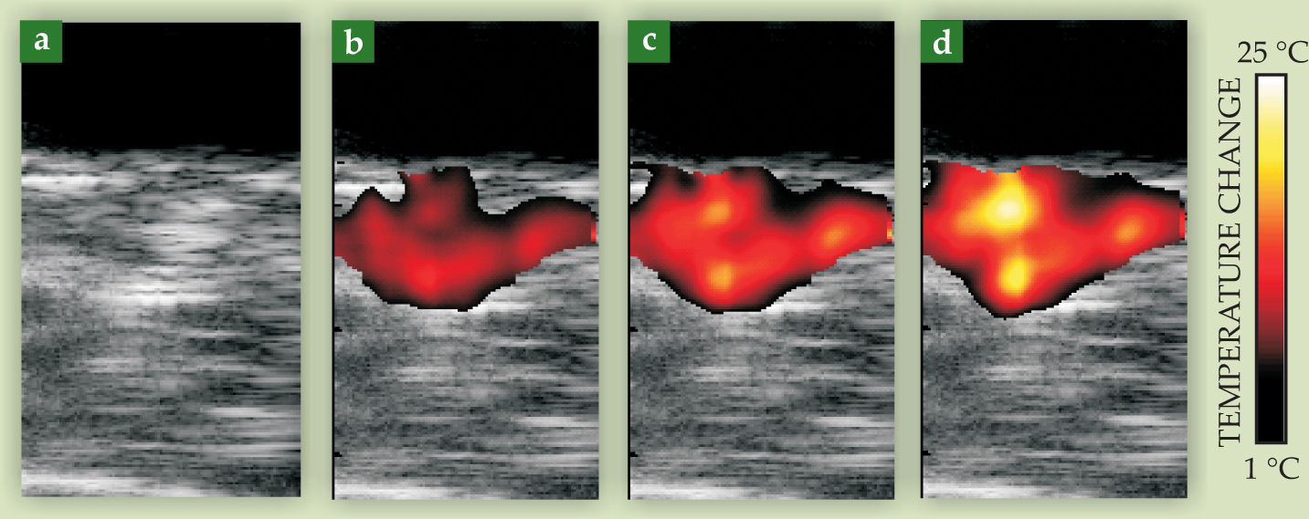 Figure 6. Photoacoustic imaging of temperature during photothermal cancer therapy of a tumor-bearing mouse. The mouse was injected with optically absorbing gold nanorods targeted to a protein in the cancer cells. The tumor region was then irradiated with continuous-wave laser light at the nanorods’ peak absorption wavelength. Images taken after (a) 0, (b) 60, (c) 120, and (d) 180 seconds of treatment show the temperature rise in the tumor. Each image represents a 10.5-mm by 20-mm field of view.