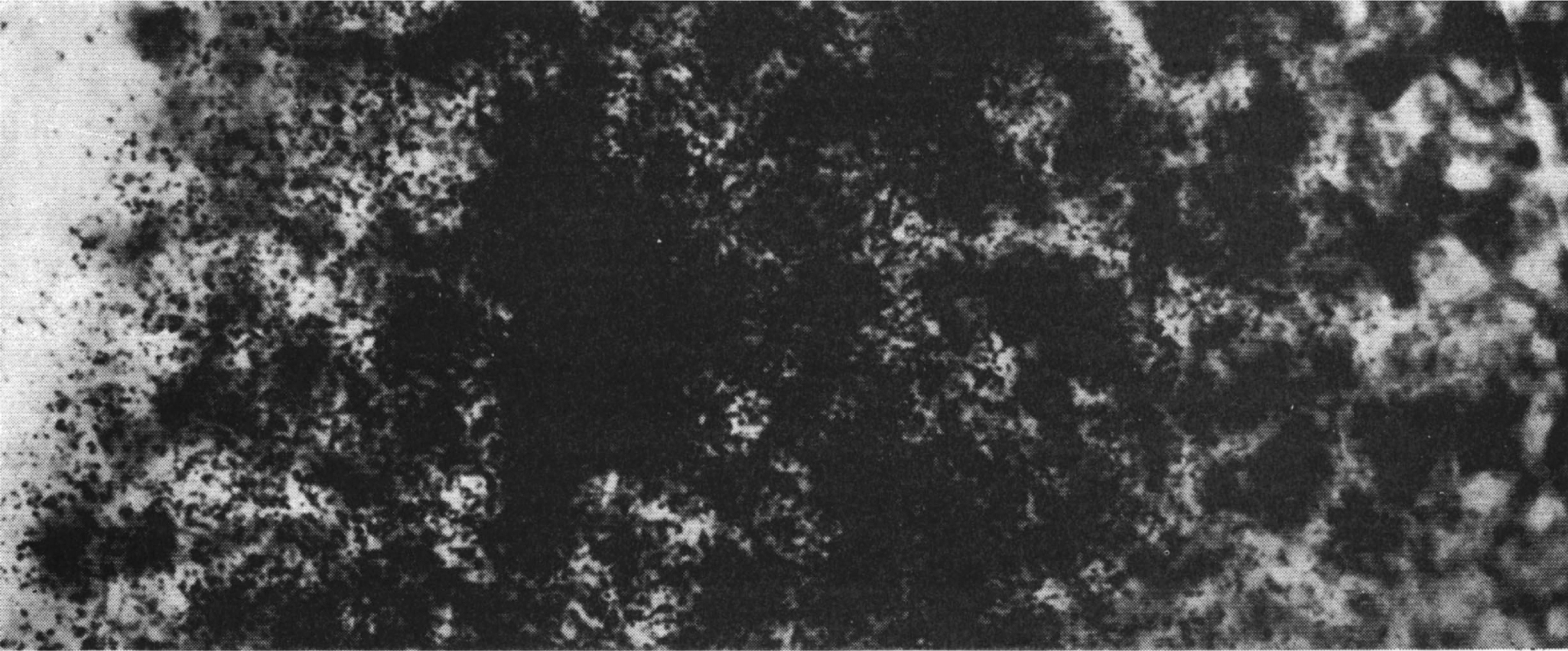 Tracer techniques. Above, carbon-14 spots its presence on film placed over a section of liver tissue. Magnified 600 times. At right, radiophosphorus shows up in the enamel of a monkey’s tooth (from which all but the enamel has been drilled away) in this 60-hour exposure.