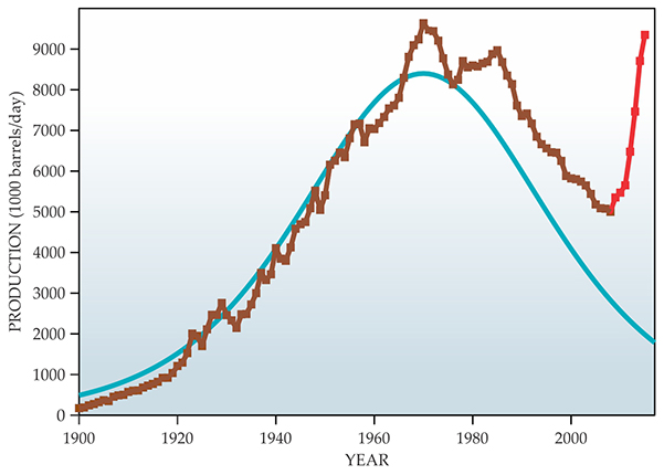 Hubbert’s prediction for the US gave an impressively accurate account of the following 50 years. The actual peak came in 1970 at 9 million barrels per day and then declined in accord with the logistic curve, as shown in figure 2.