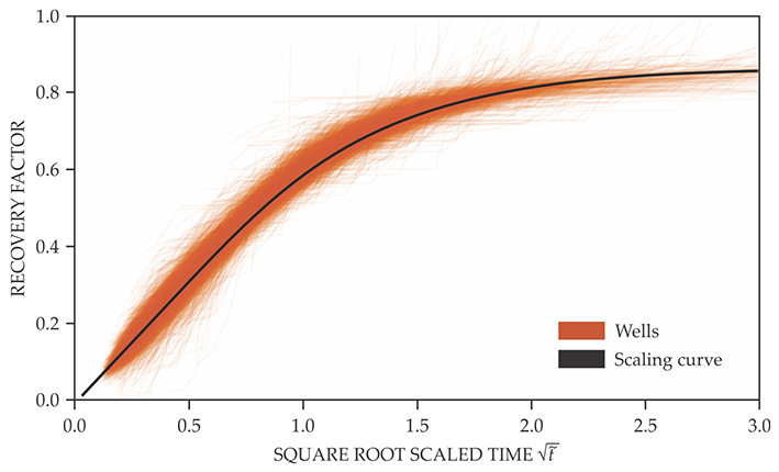 The result is one curve (see figure 3) that gives a reasonable description of the behavior in time of all wells in the play. To apply the curve to any given well, the production curve from that well must be rescaled by two parameters. The time axis must be rescaled by and the cumulative production axis must be rescaled by ℳ. Those parameters are not known and must be obtained by fits to production. One can view the fitting process as an efficient way to learn, by observing a well’s early history, how much will come out and how long it will take.